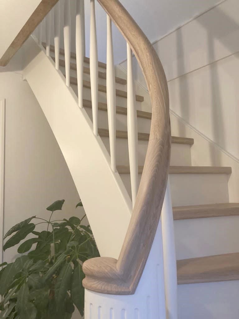 Det er slet ikke nødvendigt at hive alt ned fra øverste hylde for at lave en flot og lækker trappe, der oser af stil. Det er Mettes trappe et meget fint eksempel på. Ingen er i tvivl om at her er en eksklusiv trappe, selvom den ikke skilter med det. Detaljerne er nøje udvalgte – som fx buede balustre i stedet for runde standardbalustre, skjulte samlinger, riller i startstolpe og nøglehulsformet håndliste. En overpyntet trappe kan hurtigt komme til at ”larme”. Derfor er hellere lidt – men godt, det bedste råd, jeg kan give, når trappen skal designes. Også selvom det er fristende at lade sig rive med af alle mulighederne.