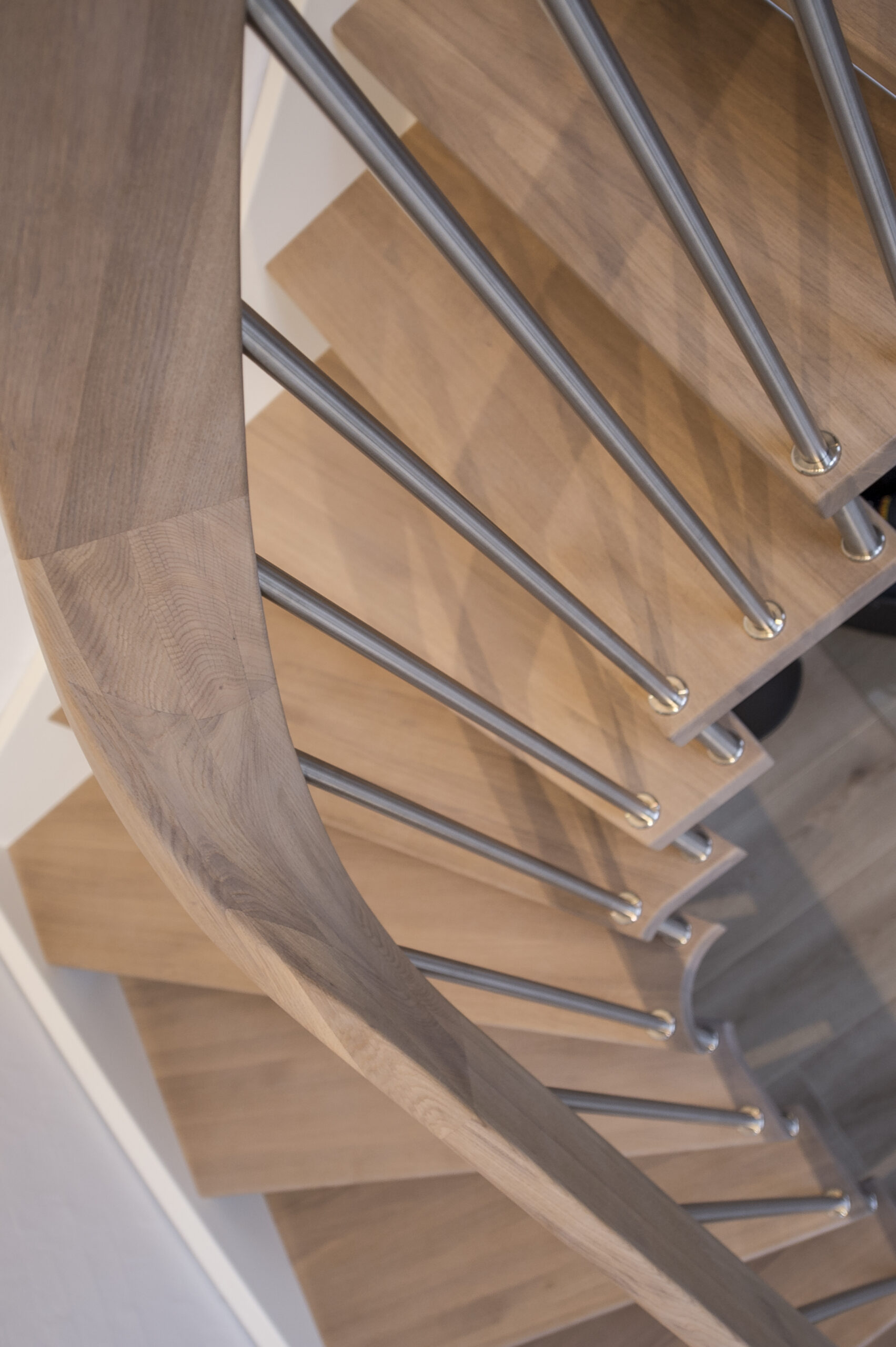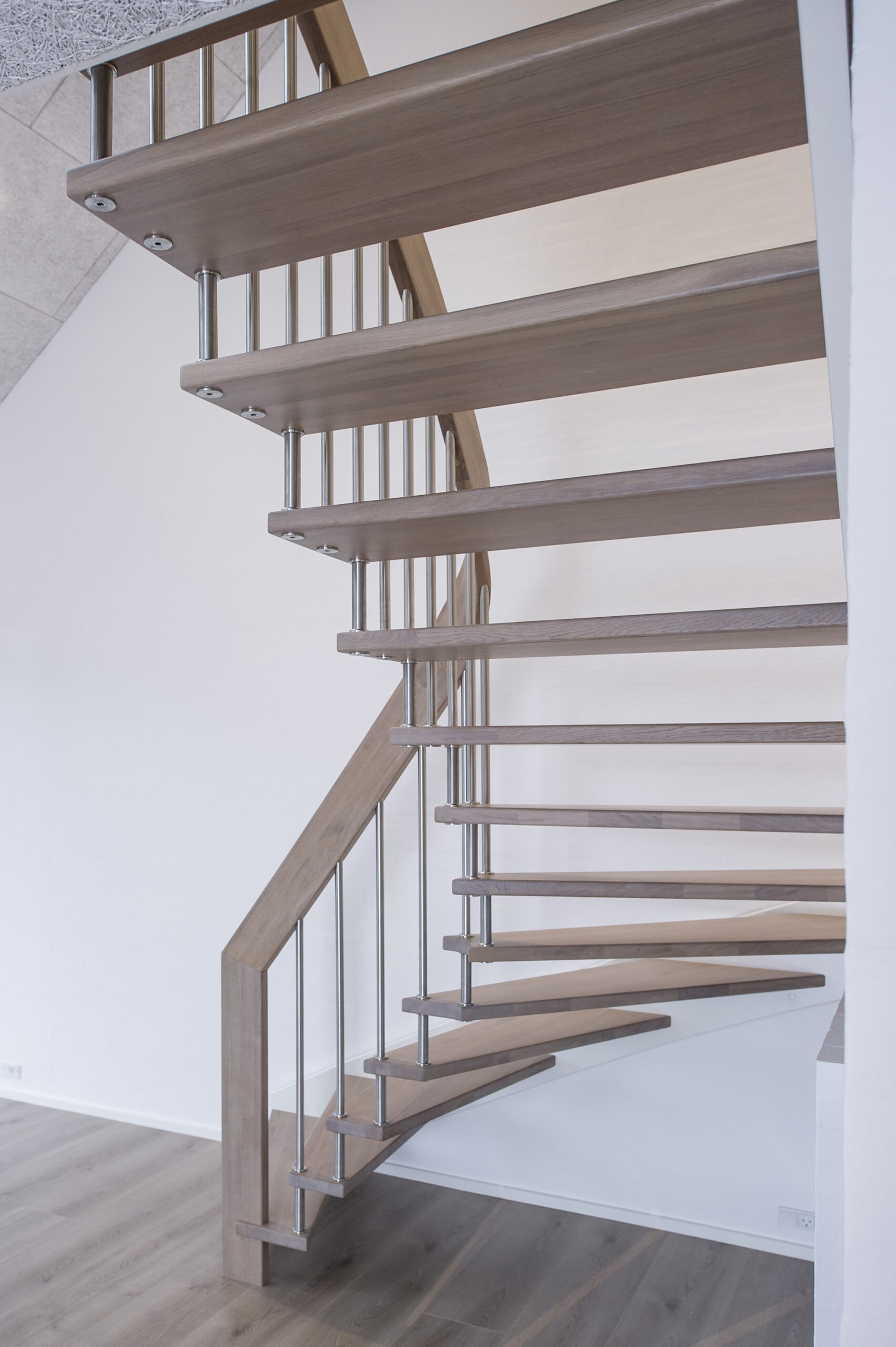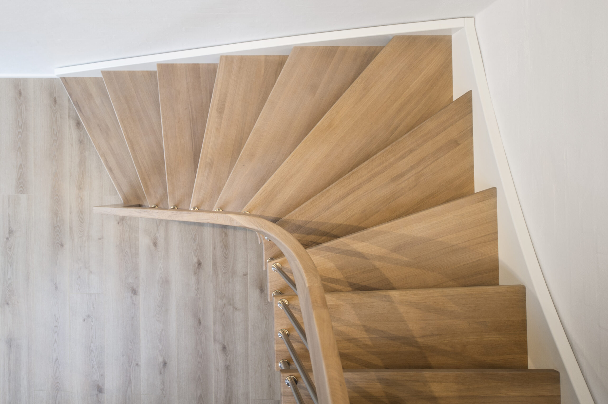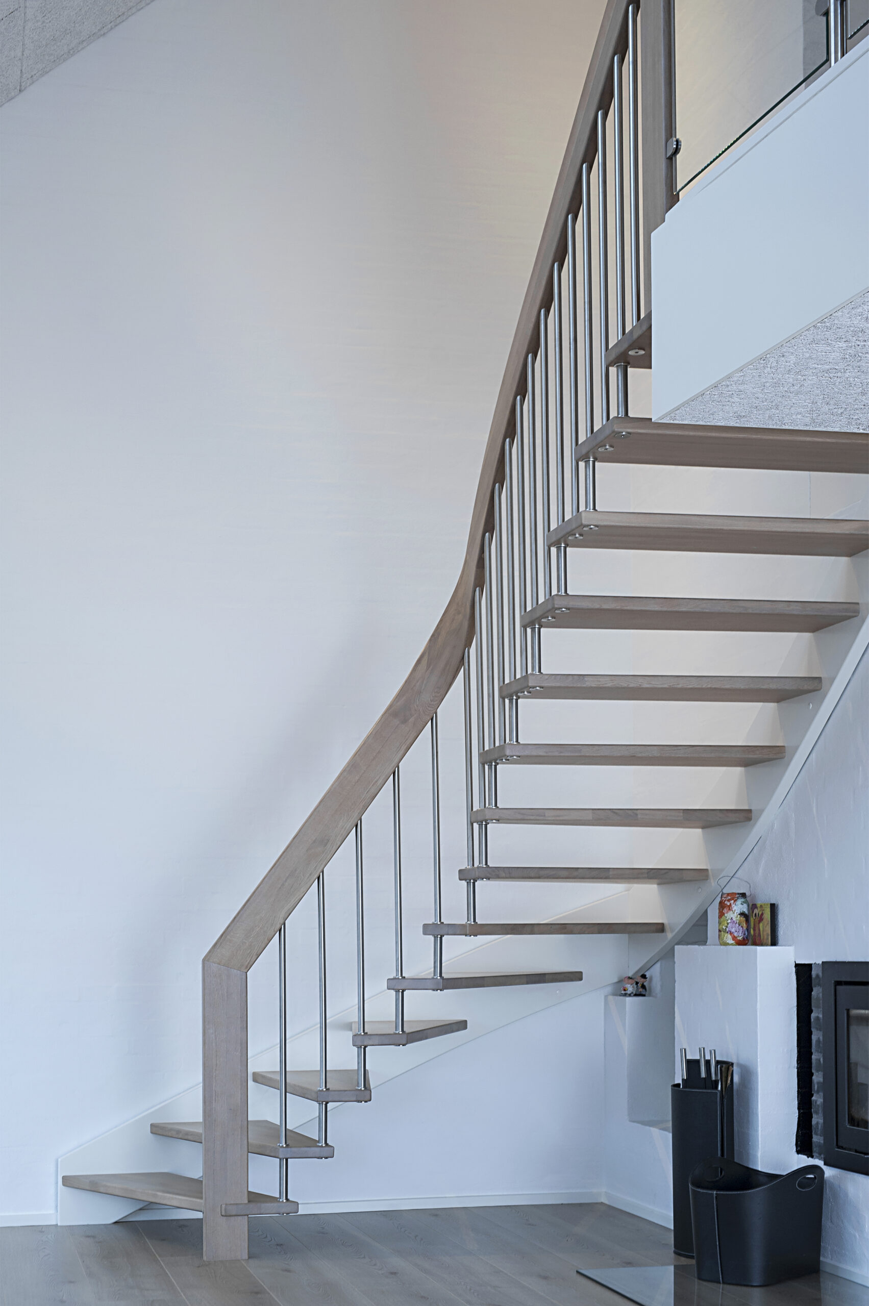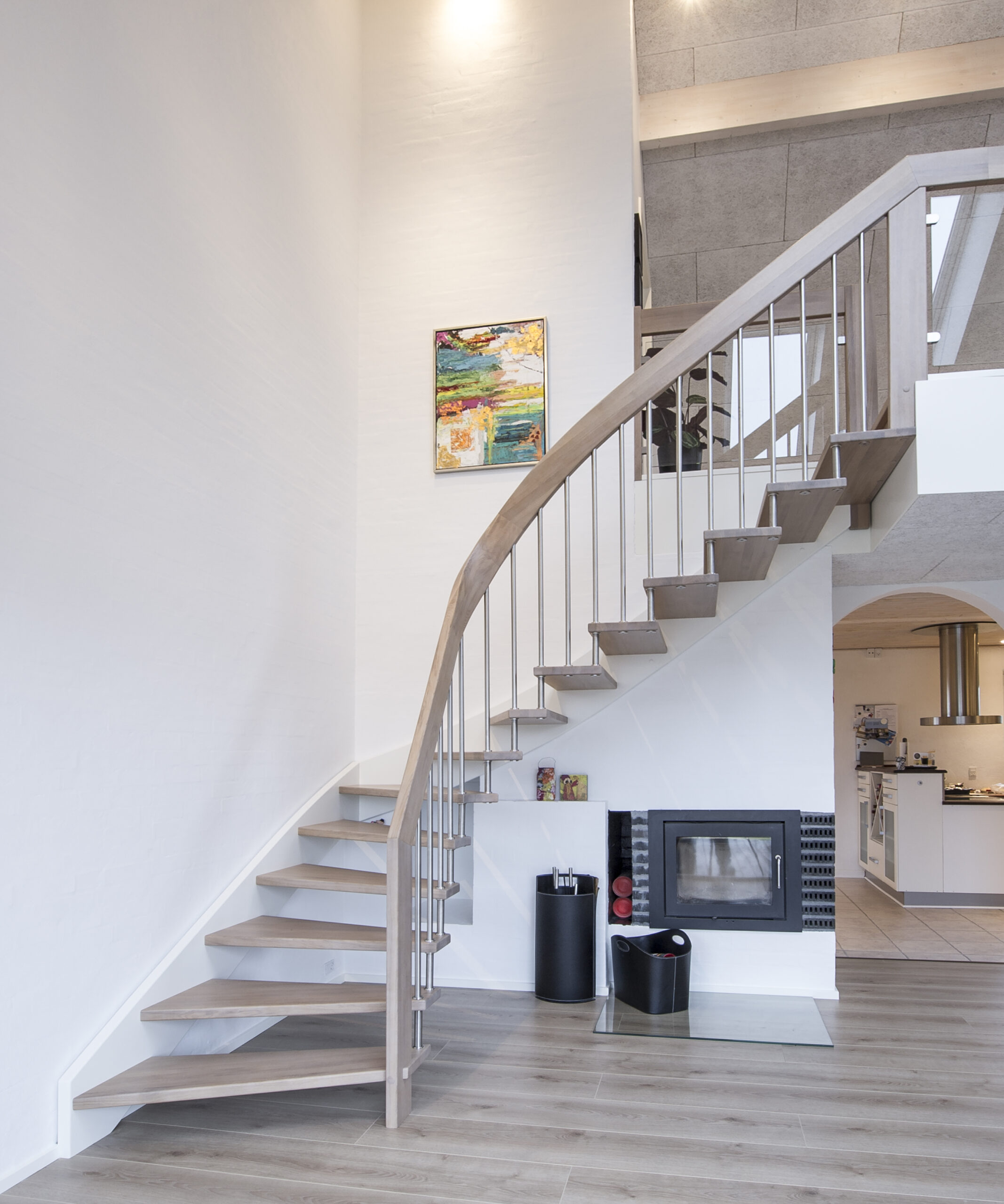 T54 er en minimalistisk kvartsvingstrappe med krumning og elementer af stål og glas.