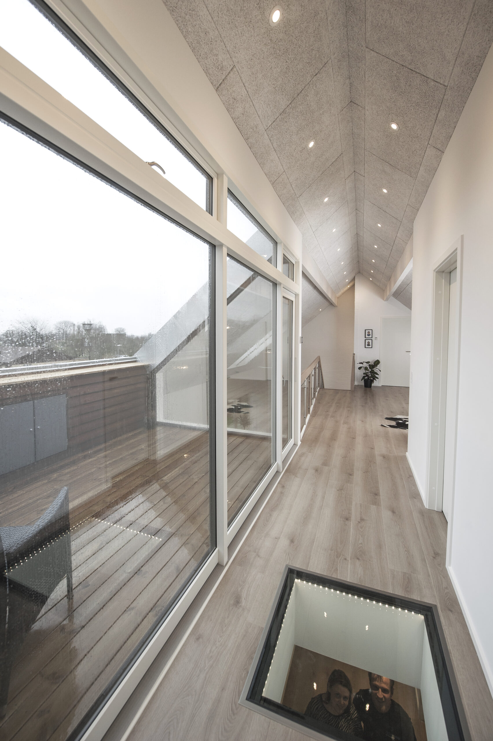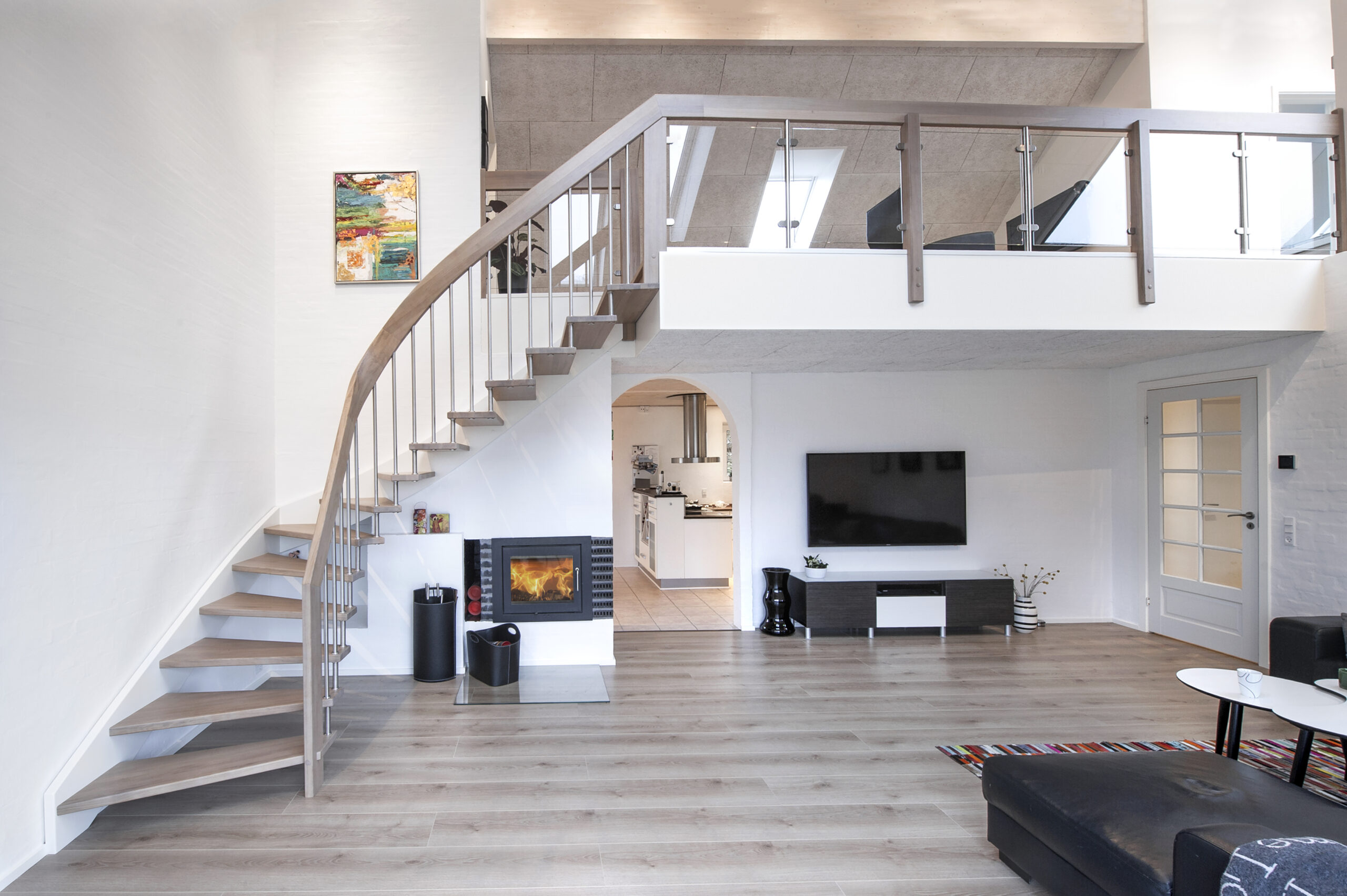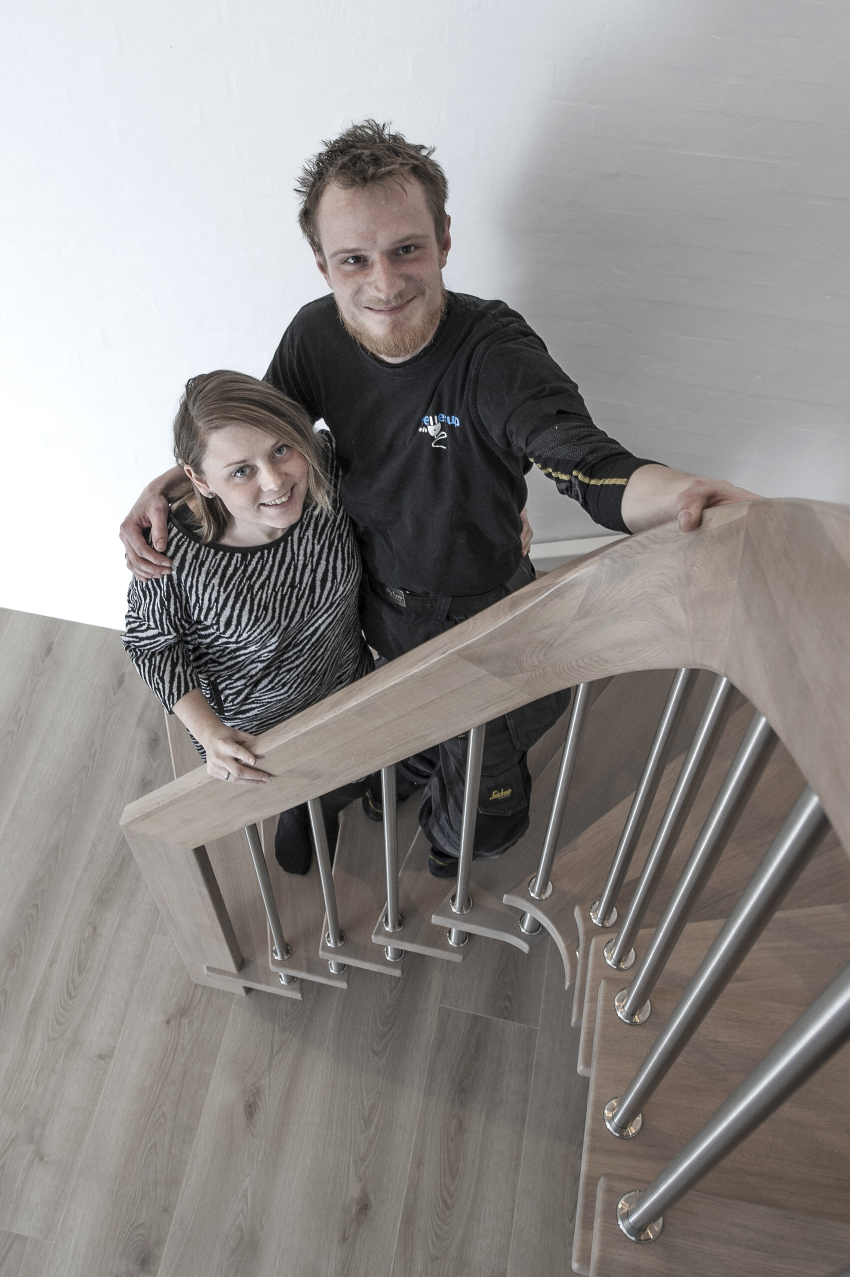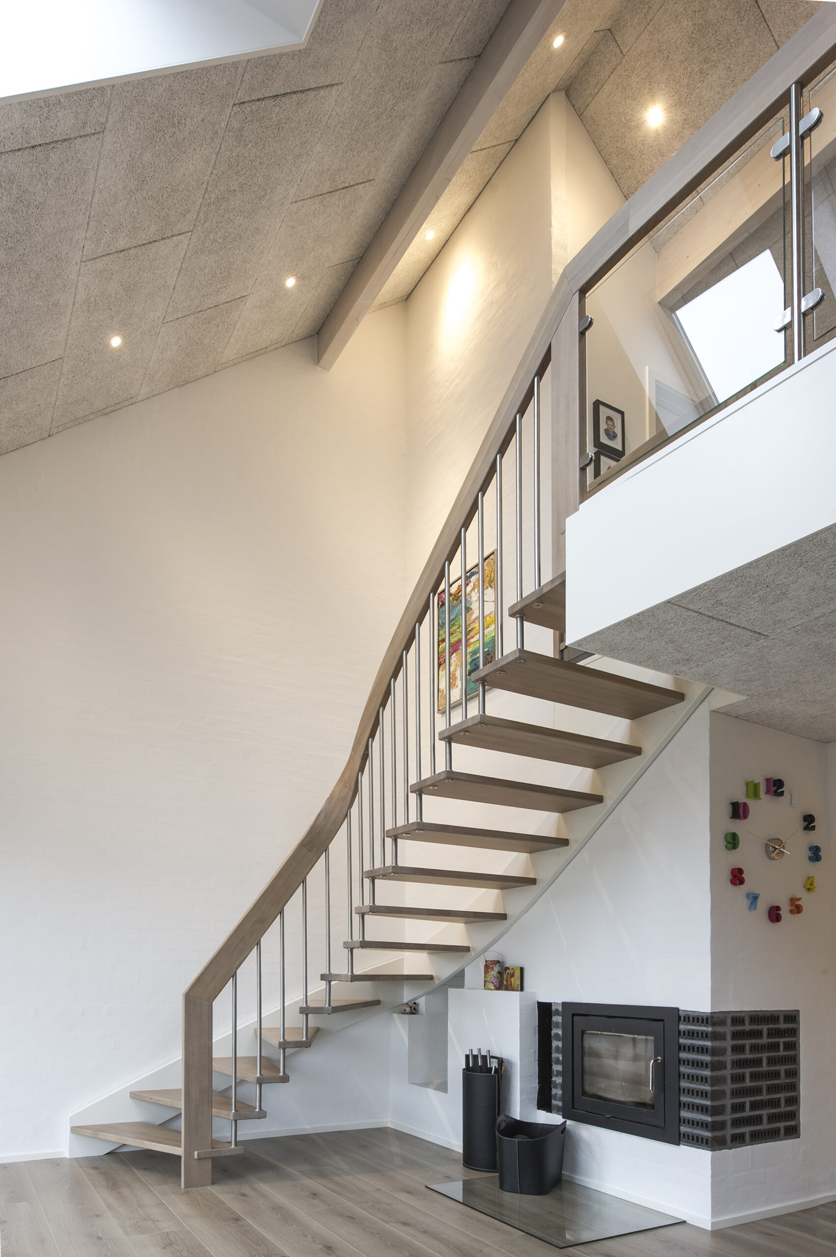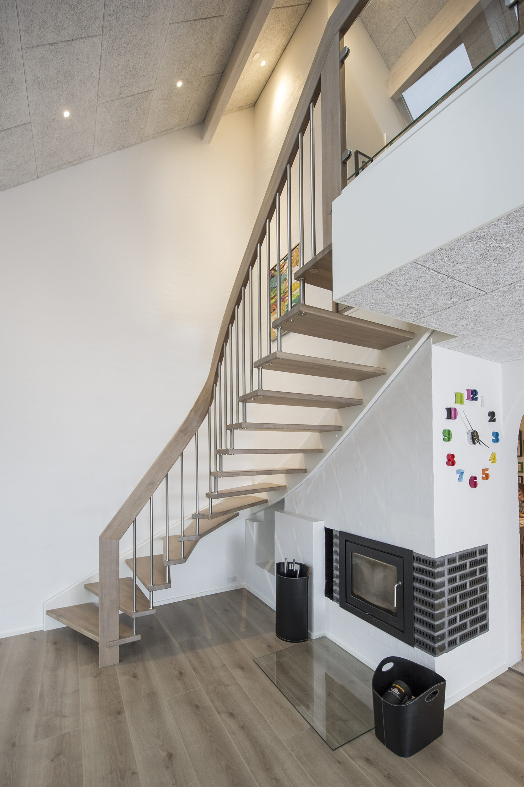 T54 er en minimalistisk kvartsvingstrappe med krumning og elementer af stål og glas.