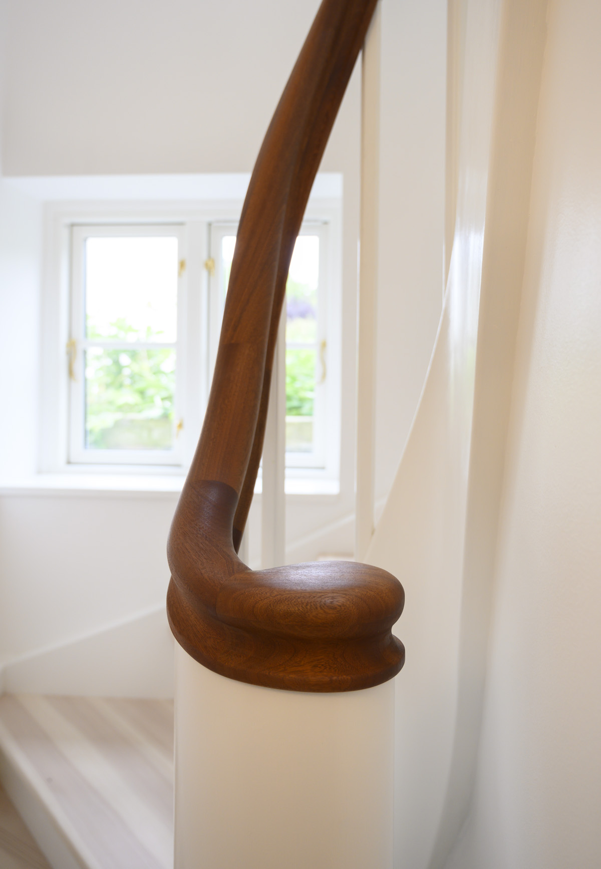 Den mørke håndliste i mahogni har et ubrudt forløb og forbinder etagerne flot.